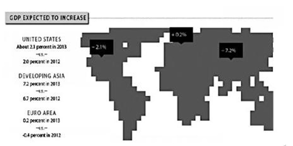 Picture 1 shows that American GDP is expected to grow about 2.1% in 2013 since its growth rate reached 2% in 2012. GDP of the developing country—Asia increased by 6.7% last year, and is expected to reach 7.2% this year. Comparing with the drop of 0.4% last year, the GDP of Euro area is expected to grow by 0.2% in 2013.