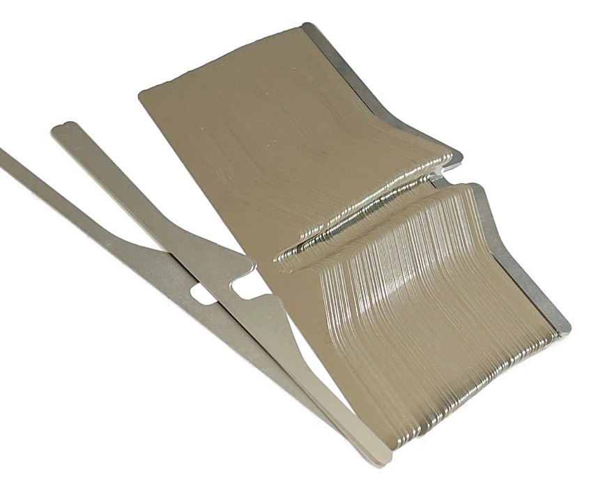 Professional on punching profile dents of material 301&420, annual output is 300,000,000 pcs,1 million pieces each day. Thickness from 0.14-0.70mm, length type is 94,100,101,102,104,105,113mm. Perfect polishing like mirror and No bur, straight upright enough for reed making directly.