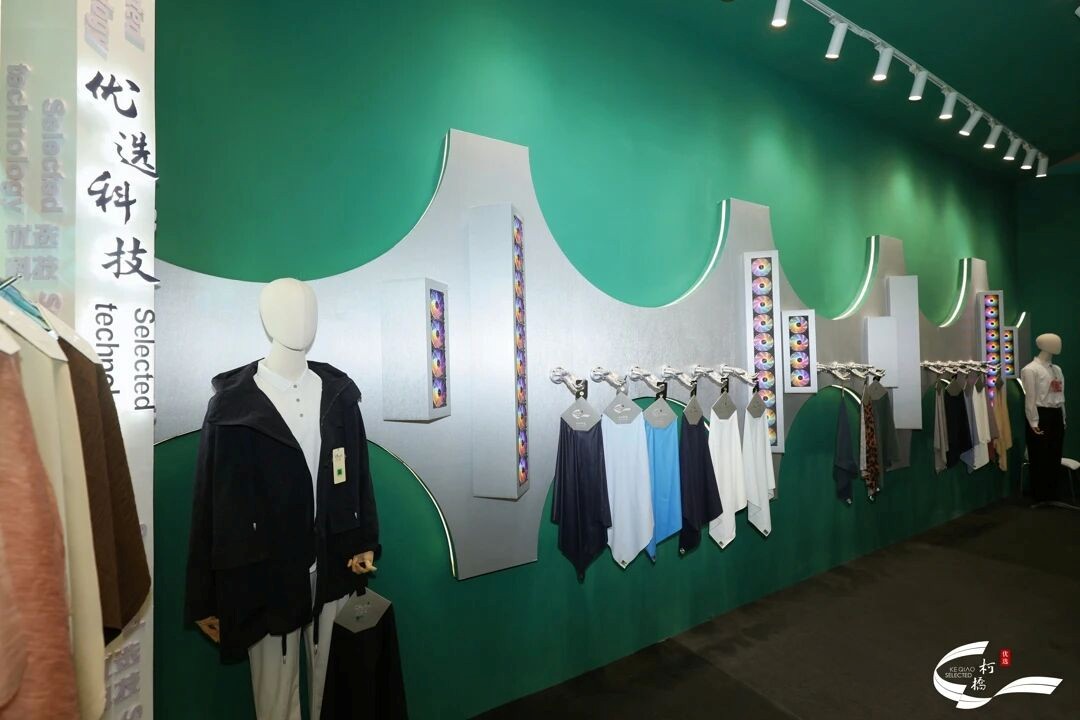 The "Selected Technology" area showcases Keqiao's technological research and development and application capabilities in fabrics. The exhibited products widely utilize advanced materials such as viscose, cupro fiber, nylon, and spandex, endowing the fabrics with diverse functions such as water repellency, quick-drying moisture absorption, UV protection, antibacterial properties, elasticity, abrasion resistance, machine washability, deodorization. These products respond to the consumer market demands of outdoor, sports, and leisure activities, expanding the application boundaries of textile fabrics.