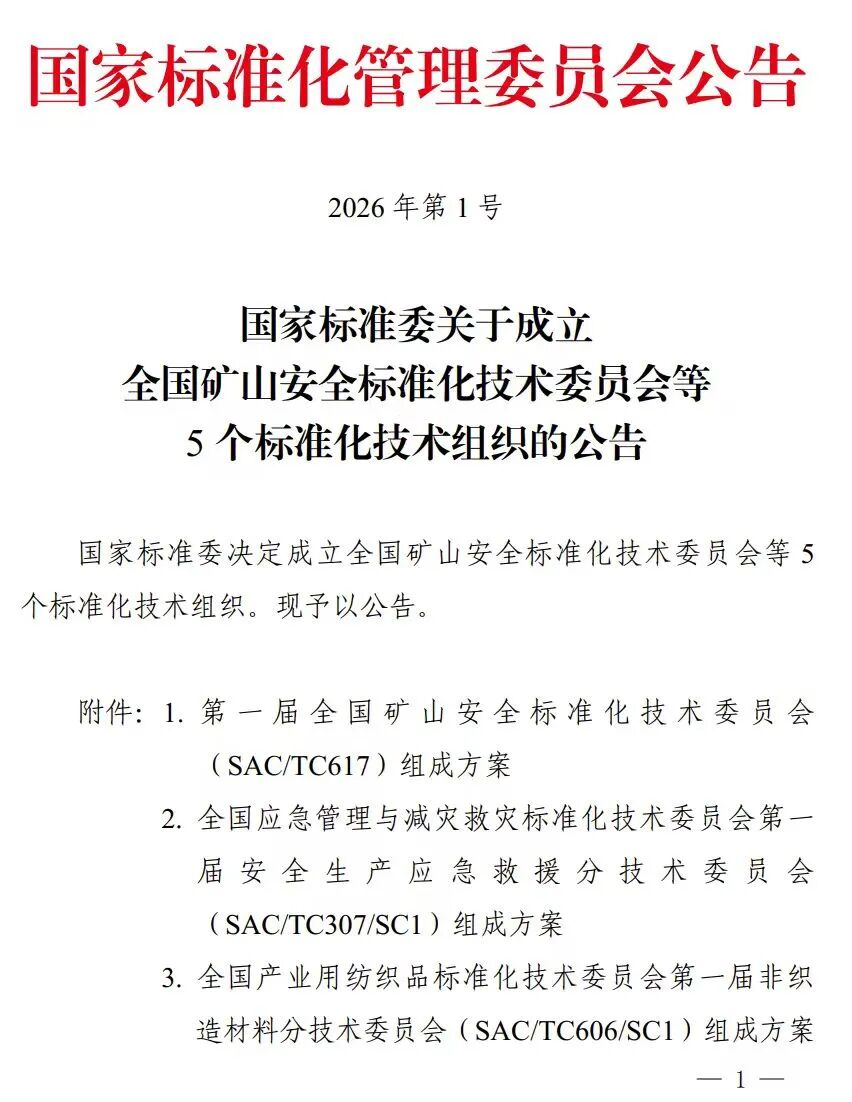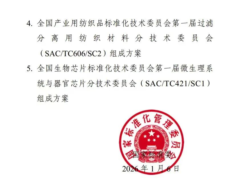Recently, the National Standardization Administration issued Announcement No. 1 of 2026, officially approving the establishment of the Subcommittee 1 on Nonwoven Material of National Technical Committee 606 on Technical Textiles of Standardization Administration of China (SAC/TC606/SC1) and Subcommittee 2 on Filtration and Separation Textiles of National Technical Committee 606 on Technical Textiles of Standardization Administration of China (SAC/TC606/SC2). The formation of these two subcommittees marks a crucial step in the standardization development of China's industrial textiles sector in specialized fields.